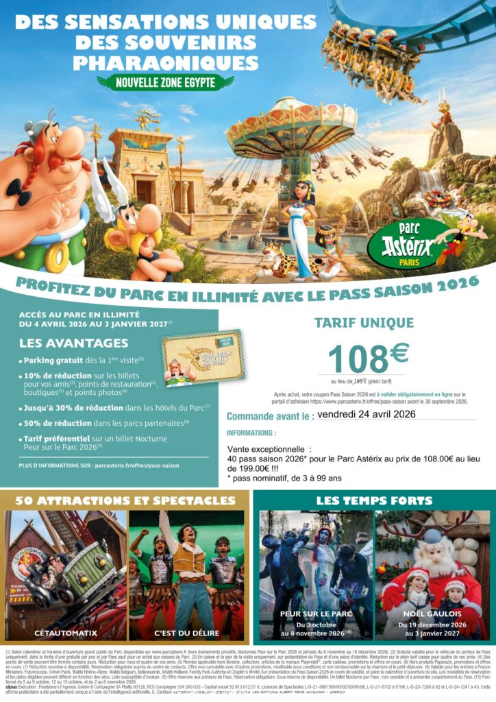 Non classé « Ils sont fous dans cet ASMA RP !!! » 1 avril 2026 JMD 5 Views L’ASMA RP vous propose une vente exceptionnelle de pass saison 2026 pour le parc Astérix ! Vente limitée à 40 pass et jusqu’au 24 avril 2026.« Ils sont fous dans cet ASMA RP !!! » La Note ICI